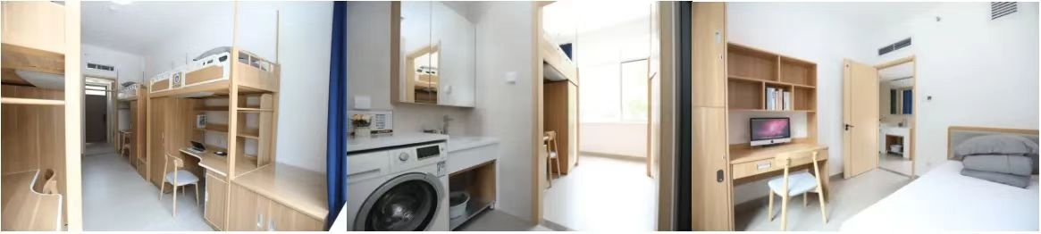 每間公寓均采用上鋪下居的雙層家具,每兩個居室共用一個小廳,供同學們交流。宿舍公共區域每層設置四個衛生間、淋浴間和盥洗室,不同樓層盥洗室內還分布有洗衣機、直飲水機等。每層樓設有數量不等的大型活動室以及學生工作人員工作與生活用房,便于學生就近組織班會及黨、團支部組織生活等活動。公寓內配備紫荊園和桃李園兩座現代化學生餐廳。
