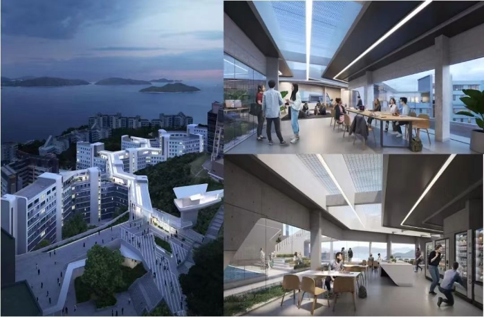 該學生宿舍于2023年完工,預計容納1500多名學生,約35500㎡的宿舍設施包括了生活、學習、娛樂和休閑的共用區域。宿舍被組建成三種不同的群組,由不同數量的單人或雙人間組合在一起,18至36名學生可共用一個公寓形成一個相對獨立的“家”,從而培養歸屬感以增加凝聚力。其中Y型宿舍設有學習區、休息室和廚房,可容納27或36名學生,V型宿舍為錯層式建筑,可容納36名學生,設有兩層樓高的共用生活空間,線型公寓可容納18名學生,包括一個設置廚房的開放式起居空間[2]
