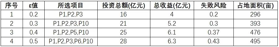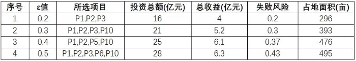 基于模型建立和算法求解的思路,使用Python編程語言構建求解流程。核心代碼結構包括:載入項目數據,構造參數字典;對每個ε值設定0.2-0.5之間不同的失敗風險值;對每個ε值構建并求解一個混合整數規劃問題;輸出所選項目組合、投資總額、總收益失敗風險與占地面積。結果如下表: