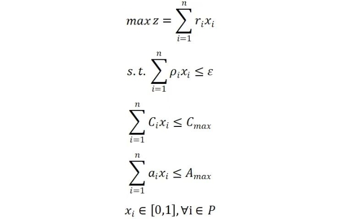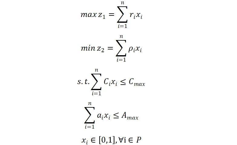 目前,在多目標混合整數規劃建模研究方面,主要集中在供應鏈優化、能源管理等領域,如Teh等人[5]通過構建多目標混合整數線性規劃模型,研究棕櫚油生物質廢棄物轉化為高收率生物油涉及的年化總利潤和全球變暖潛力權衡問題。Jabarzadeh等[6]通過構建可持續水果閉環供應鏈網絡的多目標混合整數線性模型,同時考慮經濟、環境和社會指標,即最小化網絡總成本和不同網絡活動的二氧化碳排放量,同時最大化對需求的響應度同時納入模型,并采用加權Tchebycheff方法求解Pareto最優解。資源約束下的項目群多目標選擇優化問題,核心是在多重約束條件下,選擇哪些備選項目,在最大化投資收益的同時,確保整體風險在可容忍的限制范圍內。
