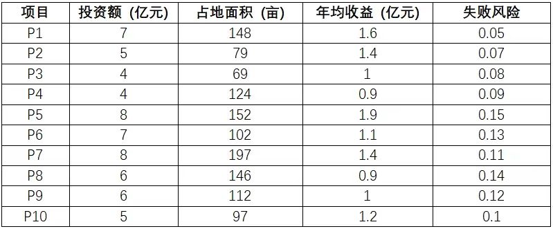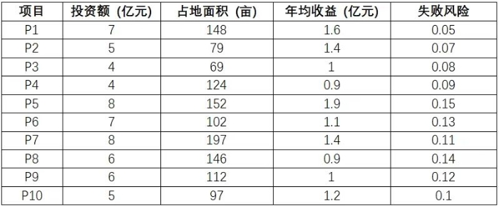 (2)已知年均收益、投資額、占地面積、失敗風險等指標參數;