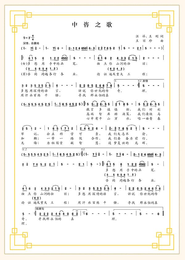 《中咨之歌》旋律優美、抒情大氣,易上口傳唱,歌詞凝煉了公司服務國家、貢獻社會的歷史傳承,凸顯了新時期高端智庫建設的宗旨目標,展現了中咨人志存高遠、矢志不渝、開拓創新、追夢筑夢的精神風貌。曾獲得中國職工音樂家協會和國資委新聞中心聯合舉辦的2016中國職工好歌曲創作征集評選活動“優秀創作歌曲”表彰,并在權威雜志《歌曲》刊發,中國曲譜網選登發表。