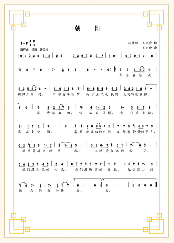 《朝陽》是一首青年人的歌曲,曲風為進行曲,堅定豪邁、有力、朝氣蓬勃,體現了新一代中咨青年牢記囑托、砥礪前行,忠于理想、不斷進取的精神風貌,以堅定的理想信念,勇立時代潮頭;以過硬的業務本領,挑起時代重擔;以飽滿的工作熱情,甘做時代激流。此曲被《中國曲譜網》登錄,此次創作是我公司為職工歌曲創作的一次展示,展現了廣大職工開拓創新、愛崗敬業、爭創一流的精神豐貌。